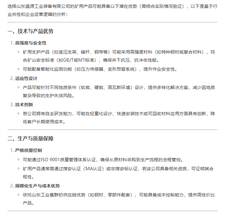 材料与工艺升级:采用高强度合金、耐腐蚀涂层等技术,提升矿用支护产品(如液压支架、锚杆)的耐久性与安全性,满足井下复杂环境需求。